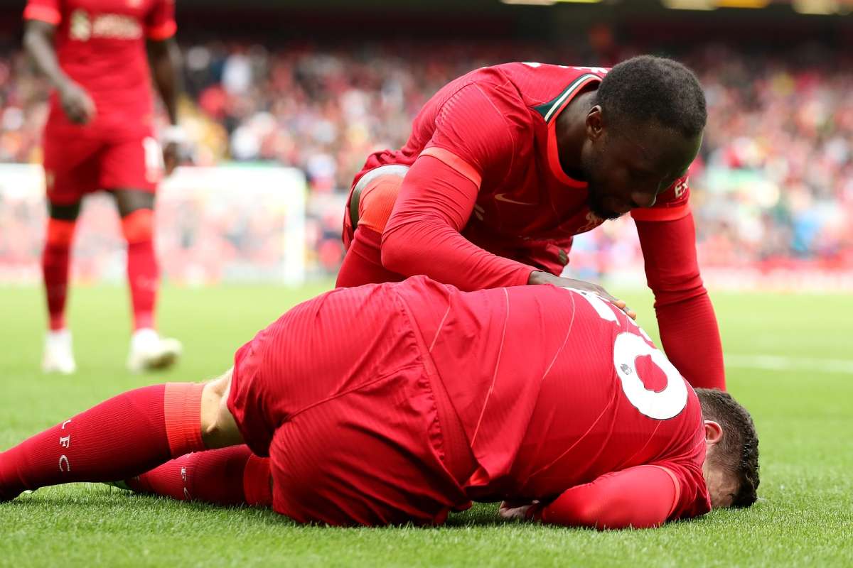 Dia pun menambah panjang daftar pemain The Reds yang harus menepi akibat jadi pesakitan. Di lini serang Sadio Mane Mohamed Salah dan Diogo Jota bahkan diturunkan. Pemain Liverpool Andrew Robertson.